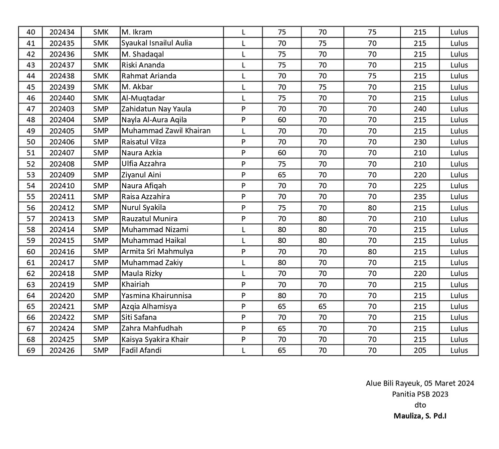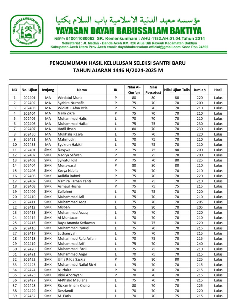 Senin(04/03/2024) Sehuhungan dengan terlaksananya Pendaftaran, Ujian Lisan dan Tulisan, maka kami Panitia Penerimaan Santri Baru (PSB) Yayasan Dayah Babussalam Baktiya Mengumumkan Kelulusan santri dengan keterangan Lulus Murni, yaitu santri yang lulus dalam mumpuni Test Baca Al-Qur`an, Baca Kitab, Psycotest dan Ujian Tulis Pendidikan Umum.