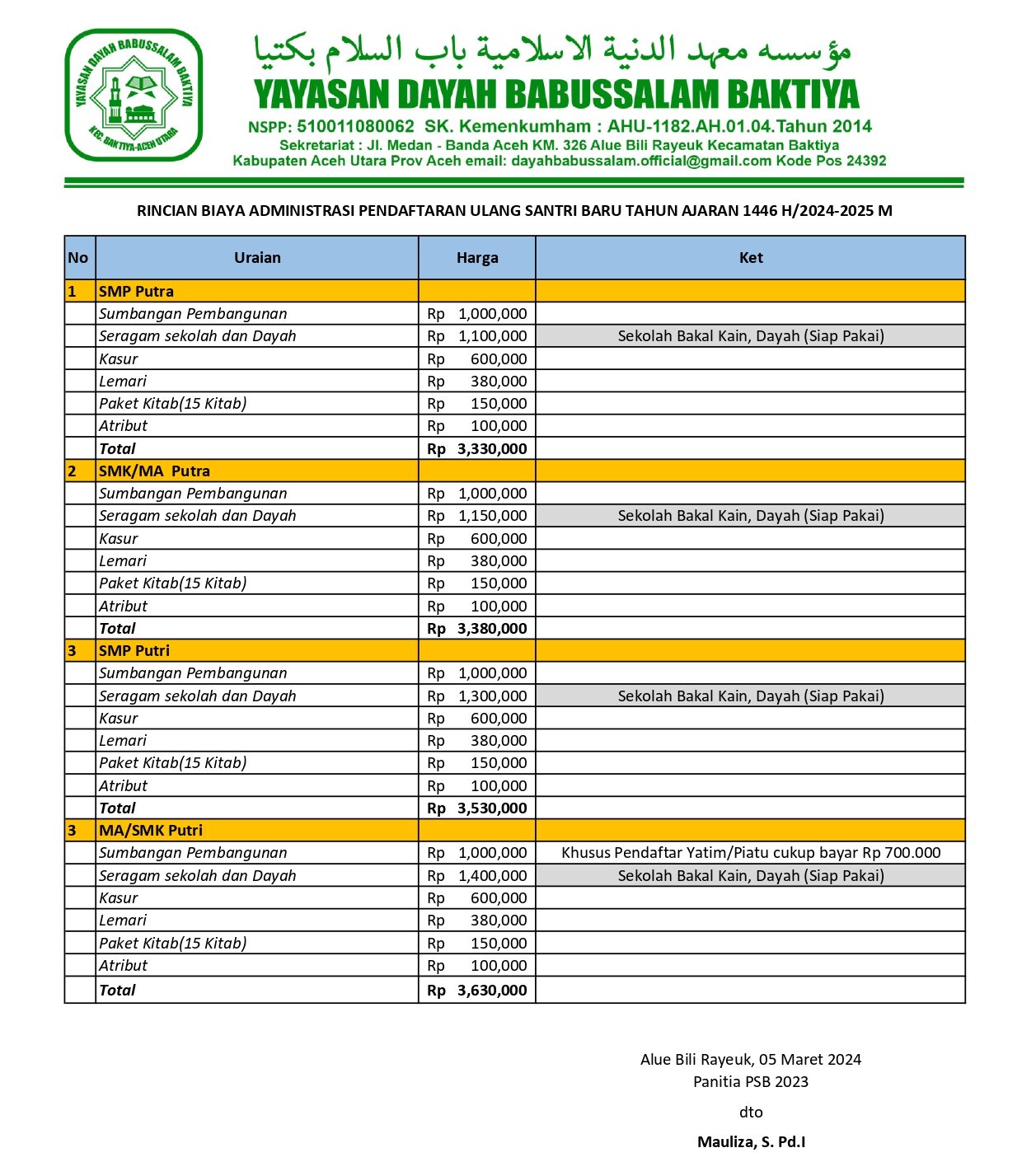 Berikut Rincian Biaya Administrasi Pendaftaran Ulang Santri Baru Tahun Ajaran 1446 H: